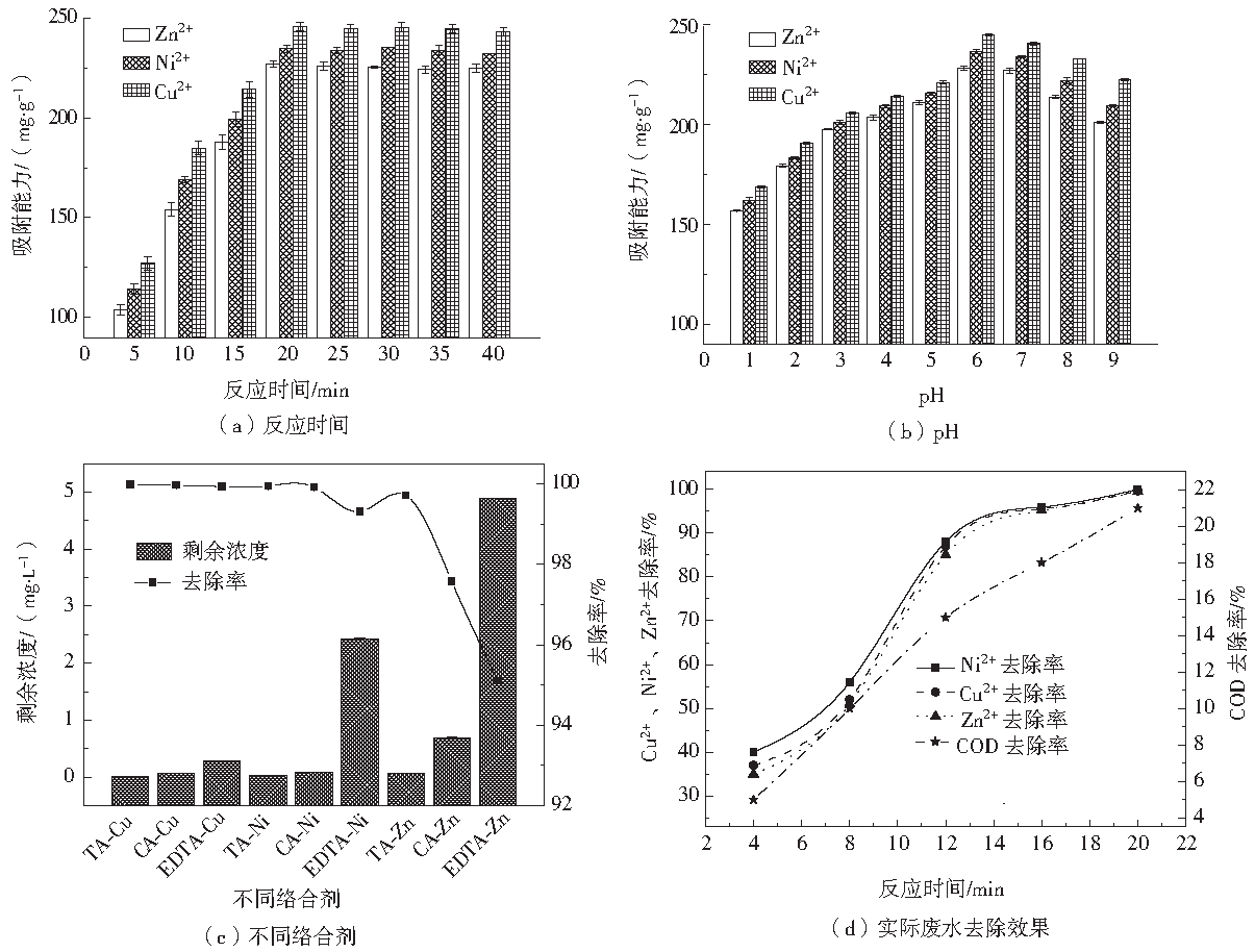在室溫條件下,取250 mL、100 mg·L−1模擬CA-Cu、CA-Ni、CA-Zn廢水置于250 mL 錐形瓶中,加入0.1 g重金屬捕集劑PADTC,置于搖床中振蕩5 min后再靜置15 min,取上清液過濾后用原子吸收分光光度計測定溶液中殘留的重金屬離子濃度,分別研究了pH和反應(yīng)時間對PADTC去除重金屬的影響,以及對CA、TA、EDTA 3種絡(luò)合劑與Cu、Ni、Zn 3種重金屬離子絡(luò)合后的處理效果。