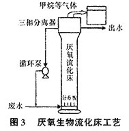 厭氧生物流化床可視為特殊的氣體進(jìn)口速度為零的三相流化床。這是因?yàn)閰捬醴磻?yīng)過(guò)程分為水解酸化、產(chǎn)酸和產(chǎn)甲烷3個(gè)階段,床內(nèi)雖無(wú)需通氧或空氣,但產(chǎn)甲烷菌產(chǎn)生的氣體與床內(nèi)液、固兩相混和即成三相流化狀態(tài)。厭氧生物流化床工藝如圖3所示。為維持較高的上流速度,需采用較大的回流比。厭氧生物流化床內(nèi)微生物種群的分布趨于均一化,在床中央?yún)^(qū)域生物膜的產(chǎn)酸活性和產(chǎn)甲烷活性都很高,從而使其有效負(fù)荷大大提高。
